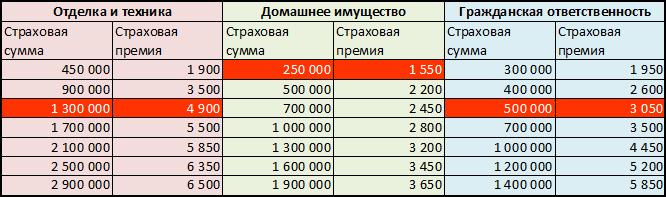 - Объекты. Отделка и бытовая техника (1 300 000 рублей), домашнее имущество (250 000 рублей), гражданская ответственность (500 000 рублей).
